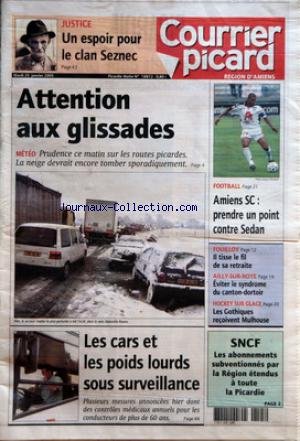 JUSTICE - UN ESPOIR POUR LE CLAN SEZNEC - ATTENTION AUX GLISSADES - METEO - PRUDENCE CE MATIN SUR LES ROUTES PICARDES - LA NEIGE DEVRAIT ENCORE TOMBER SPORADIQUEMENT - LES CARS ET LES POIDS LOURDS SOUS SURVEILLANCE - FOOTBALL - AMIENS SC - PRENDRE UN POINT CONTRE SEDAN - FOUILLOY - IL TISSE LE FIL DE SA RETRAITE - AILLY-SUR-NOYE - EVITER LE SYNDROME DU CANTON-DORTOIR - HOCKEY SUR GLACE - LES GOTHIQUES RECOIVENT MULHOUSE - SNCF - LES ABONNEMENTS SUBVENTIONNES PAR LA REGION ETENDUS A TOUTE LA PICARDIE. CLIQUEZ ICI POUR TÉLÉCHARGER LIVRE